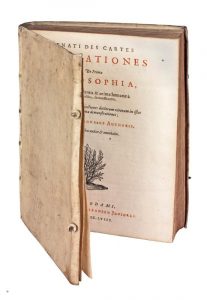 Sixième édition latine. # Comme les deux éditions elzéviriennes qui l'ont précédée, notre édition se compose de trois parties sous pagination séparée contenant dans la première les Méditations, les sept Objections et les Notes, dans la deuxième l'Appendice aux objections, et dans la troisième la Lettre à Gisbertus Voetius. # Très bel exemplaire, d'une grande pureté, dans sa première reliure en vélin hollandais. # Ex-libris manuscrit daté de 1661 sur une la première garde. # Guibert, 53-55.