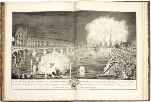 Unique édition de ce somptueux livre de fête célébrant le mariage par procuration d'Élisabeth de France, fille aînée de Louis XV, et de Philippe de Bourbon, second fils de Philippe V d'Espagne, le 26 août 1739. # Élisabeth, alors âgée de douze ans, ne vit pour la première fois son époux qu'ensuite, en territoire espagnol, et le véritable mariage eut lieu le 25 octobre. Les festivités prirent notamment place sur une île artificielle construite par l'architecte italien Servandoni entre le Pont Royal et le Pont Neuf, devant le Louvre. Soixante bateaux illuminés donnèrent le signal du feu d'artifice, du combat de monstres marins, de torrent de feux et d'eau et d'un « berceau d'étoiles ». # L'illustration de l'ouvrage compte parmi les plus belles des livres de fêtes du xviiie siècle. # Elle se compose d'une vignette sur le titre de Bouchardon gravée par Soubeyran, d'une vignette en-tête par Rigaud représentant une joute navale sur la Seine et de 13 planches d'une dimension majestueuse, dont 5 à pleine page et 8 à double page, gravées par Blondel d'après Bonel, Gabriel, Sallet et Servandoni. On y remarque en particulier les deux célèbres vues du Feu d'artifice donné sur la Seine et des Décorations et illuminations des salons de l'Hôtel-de-Ville. # Reliure aux armes de la ville de Paris. # Reliure restaurée, charnières fendillées, un coin cassé. # Cohen, 288 – Mourey, 210-222 – Vinet, n°519 (collation erronée) – cat. Ruggieri, n°570.