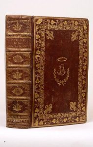 auréole étoilée dorés, dos orné d'atributs religieux et de triangles rayonnants alternés, doublure et gardes de papier coloré doré, tranches dorées (Reliure du XIXe siècle).