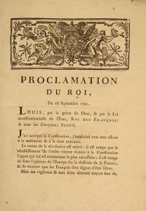 Proclamation du Roi... relatif à la Fédération générale des Gardes nationales & des Troupes du Royaume. Du 10 Juin 1790. P., Imp. Royale, 1790. 6 pp. Institution de la Fête de la Fédération au Champs de Mars organisée par La Fayette. # Loi relative à la proclamation de la Loi constitutionnelle. Donnée à Paris, le 15 Septembre 1791. Paris, Imp. Royale, 1791. 3 pp. Signé par les administrateurs du directoire du département de l'Eure à Evreux. # Proclamation du Roi, du 28 Septembre 1791. Perpignan, Reynier, s.d. 4 pp. # Loi qui détermine les causes, le mode et les effets du Divorce. Du 20 Septembre 1792... Castres, Robert, An I. 15 pp. Signé par l'administrateur composant le Directoire du district de Gailhac.