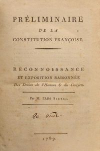Texte théorique très dense dans lequel Sieyès présentait sa version de la future déclaration des droits de l'Homme. Elle se heurta à la proposition concurrente de Mounier et au scepticisme de la plupart des membres du comité. # On a relié à la suite : SIEYÈS. Essai sur les privilèges. Nouvelle édition. S.l., 1789. – FAVIER. Doutes et questions sur le Traité de Versailles... Paris, [1789]. – [SIEYÈS]. Projet d'un décret provisoire sur le clergé. [Paris, 1790]. Manque le titre. – SIEYÈS. Dire sur la question du veto royal. Versailles, [1789]. – [SIEYÈS]. Vues sur les moyens d'éxécution... Seconde édition. S.l., 1789. – Observations sur le rapport du Comité de constitution... Versailles, 1789. – SIEYÈS. Opinion... sur les édifices religieux & la liberté générale des cultes. [Paris, 1789]. – TALLEYRAND. Des loteries. Par M. l'évêque d'Autun. Paris, 1789. # Dos et charnière frottés, un mors fendu, petit manque de cuir à un coin.