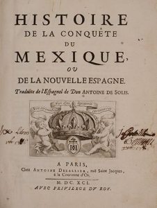 SOLÍS (Antonio de). Histoire de la conquête du Mexique ou de la Nouvelle Espagne. Paris, Antoine Dezallier, 1691. In-4, veau brun, dos orné, tranches mouchetées (Reliure de l'époque).