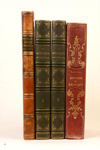 MOKE (Henri-Guillaume) et al. La Belgique monumentale, historique et pittoresque. Bruxelles, Jamar et Hen, 1844. 2 volumes in-8, demi-chagrin vert avec coins, filet doré, dos orné, tranches marbrées (Reliure de l'époque). Édition originale, illustrée de soixante-sept figures hors texte, dont sept planches de costumes coloriées et gommées, et de près de deux cent vignettes. On a joint à l'exemplaire la suite de vingt-cinq planches des Sites et monuments, parue après la publication de l'ouvrage. # JUSTE (Théodore). Panthéon national. Histoire de Belgique. Bruxelles, Jamar, s.d. In-8, demi-chagrin rouge avec coins, filet doré, dos lisse orné en long, tranches marbrées (Reliure de l'époque). Nombreuses illustrations hors texte. Des rousseurs. # [RUTLAND (John Henry Manners, duc de)]. A Tour through part of Belgium and the Rhenish Provinces. Londres, Rodwell & Martin, 1822. In-4, veau fauve, double filet doré, dos orné de filets dorés, tranches mouchetées (Reliure anglaise de l'époque). Unique édition de ce voyage en Belgique et autour du Rhin illustré de treize vues hors texte lithographiées par J. D. Harding d'après les dessins d'Elizabeth de Rutland. Des bibliothèques Moses Montefiore et Croft Lyons, avec ex-libris. Reliure restaurée, dos partiellement refait, piqûres sur les planches et marges des premiers et derniers feuillets brunies.