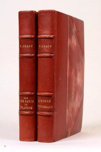 Édition originale, illustrée de huit croquis de l'auteur. # Un des 14 exemplaires de tête sur japon impérial, hors commerce, imprimé nominativement pour Marguerite Chack, l'épouse de l'auteur, à laquelle l'édition est dédiée. # Envoi autographe signé de l'auteur : En te dédiant ce livre, ma chérie, j'ai voulu exprimer toute la joie que ta présence bénie m'a donnée, à travers la guerre, comme à travers la vie. # Coiffes de la couverture déchirées, derniers témoins salis. # On joint, du même : Sur les bancs de Flandre. Paris, Éditions de France, 1927. – L'Homme d'Ouessant Du Chaffault. Paris, Alexis Redier, 1931. 2 volumes in-8, demi-maroquin rouge avec coins, tête dorée, non rogné, couverture et dos (Reliure de l'époque). Éditions originales sur grand papier : l'un des 181 sur vélin pur fil pour Sur les bancs de Flandre et l'un des 105 sur hollande pour L'Homme d'Ouessant. Envoi autographe signé de l'auteur à Ernest Martin dans chaque volume. De la bibliothèque Louis Baillargeat, avec ex-libris.
