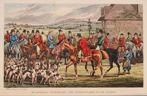[SURTEES (Robert Smith)]. Jorrock's Jaunts and Jollities ; being the hunting, shooting, racing, driving, sailing, eating, eccentric and extravagant exploits of that renowned sporting citizen, Mr. John Jorrocks. Londres, Rudolph Ackermann, 1843. In-8,...