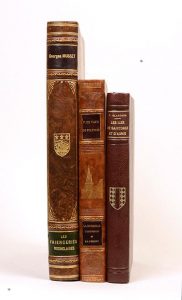 MUSSET (Georges). Les Faïenceries rochelaises. La Rochelle, chez l'auteur et tous les libraires, 1888. In-4, demi-basane racinée avec coins, filets dorés, dos orné d'armoiries et de fers dorés, tête dorée, étui (Reliure postérieure). Édition originale, illustrée de 20 chromolithographies hors texte sous serpentes légendées. Exemplaire sur vergé relié au début du XXe siècle aux armes de La Rochelle. Quelques rousseurs. # VAUX DE FOLETIER (François de). La Rochelle d'autrefois et d'à présent. La Rochelle, F. Pijollet, 1923. In-8, demi-basane fauve, dos orné de fers dorés et à froid, tête dorée, couverture (Reliure de l'époque). Édition originale, illustrée d'un frontispice et de culs-de-lampe gravés sur bois par Louis Giraudeau et de 30 photographies héliogravées hors texte. Un des 80 exemplaires sur vergé d'Arches. # BLANCHON (Pierre). Les Îles de Saintonge et d'Aunis. La Rochelle, F. Pijollet, 1931. In-8, demi-chagrin brun avec coins, dos orné d'armoiries dorées, tête dorée, couverture, étui (Reliure de l'époque). Édition originale, illustrée de 2 aquarelles en couleurs de Louis Giraudeau et de 146 photographies héliogravées dans le texte. Un des 25 exemplaires de tête sur japon.