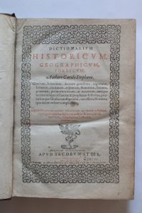 CAROLUS STEPHANUS (Charles Estienne) : « Dictionarium Historicum, Geographicum, Poeticum, Gentium, hominum, deorum gentilium, regionum… » [Genève] Apud Iacobum Stoer, 1609.