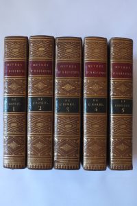 5 volumes in 8. (complet - de l’Esprit, de l’Homme, le Bonheur, lettres de Voltaire, Montesquieu et Hume, examen des critiques du livre de l’Esprit, les progrès de la Raison dans la recherche du Vrai ). Portrait-frontispice d’après VANLOO. Reliure uniforme en veau raciné. Frises dorées encadrant les plats. Roulette intérieure et sur les coupes. Dos lisse richement orné de rosaces, étoiles et motifs floraux avec pièces de titre et de tomaison en maroquin. Tranches à la feuille d’or. Cachet BARON REILLE (ancienne bibliothèque Maréchal SOULT). Très beaux exemplaires malgré quelques légers manques au cuir des tomes 2, 3 et 5.