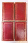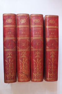 4 volumes in-8. Portrait-frontispice et 12 figures hors texte d’après BOREL et BORNET gravées par HALBOU, VIGNET, CROUTELLE, THOMAS, DUHAMEL et LE ROY. Plein maroquin rouge à long grain d’époque. Frises dorées encadrant les plats. Roulette intérieure et sur les coupes. Dos lisse orné de frises, rosace, vase et épis. Tranches à la feuille d’or. Beaux exemplaires.