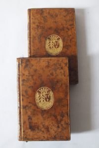2 volumes in 8 (complet). Vignette de page de titre représentant Maupertuis se battant contre un moulin à vent (premier volume), bandeaux, lettrines et culs-de-lampe. Plein veau marbré de l’époque.