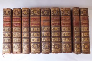 Reliure uniforme en veau marbré d’époque. (quelques légers manques notamment aux coiffes). Bandeaux, lettrines et culs-de-lampe. Dos orné d’armoiries du clergé, de motifs floraux et d’étoiles avec pièce de titre et de tomaison en maroquin grenat (manquent 3 tomaisons). Gardes marbrées.