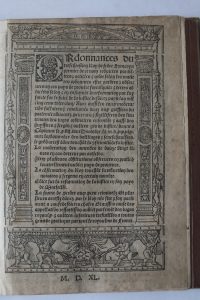 105 ff. - [9] ff. table des matières. Petit in-4 imprimé en caractères gothiques d’ordonnances du début XVIème. Page de titre illustrée d’un décor d’encadrement gravé sur bois.