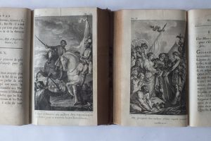 4 volumes grand in-12. Seconde édition. 20 Figures hors texte d’après MOREAU et MARILLIER gravées par DE LONGUEIL, NÉE, MAILLET, HELMAN, GAUCHER, DE GHENDT, SIMONET, DAMBRUN, DELIGNON…Demi-basane à coins postérieure. Dos à faux nerfs orné de motifs floraux avec pièce de titre (usures, un mors fendu). Cohen, 893.