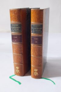 2 volumes in-8. 2 cartes et 2 plans rempliés. Demi-basane postérieure. Dos à faux nerfs orné d’un monogramme sous couronne au talon avec pièce de titre et de tomaison. Plats et gardes marbrés.