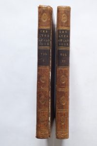 2 volumes in-8. Epître dédicatoire au roi. Plein veau de l’époque. Triple filet doré encadrant les plats avec écoinçons. Roulette intérieure. Dos lisse orné de rosaces avec pièce de titre et de tomaison. Mors fendus et premier plat du tome I détaché. Gardes marbrées. Bel état inérieur.