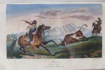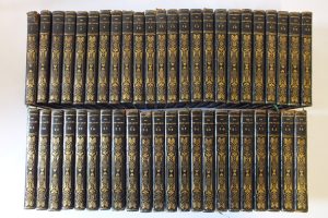 46 volumes in-8 (complet sans l’atlas). 86 planches rehaussées en couleurs gravées par CHOUBART d’après Léopold MASSARD représentant les autochtones des terres visitées dans leur habit traditionnel (remarquable fraîcheur des couleurs). Reliure uniforme en demi-veau bleu nuit. Dos lisse orné d’un important décor romantique en doré. (quelques coiffes abîmées). Plats, tranches et gardes marbrées.