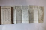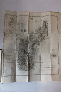3 volumes in-8. 2 grandes cartes rempliées. Petit dictionnaire français-mandégasse au début du tome II. 14 planches de tables astronomiques en fin de tome III (principalement hauteur de la lune et distance du soleil). Demi-maroquin à coins vert d’époque. Plats couverts d’un papier marbré rose. Dos lisse orné de frises et rosaces (coiffes un peu émoussées).
