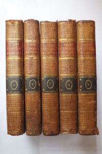 5 volumes in-8 (complet). Pleine basane marbrée d’époque. Dos lisse orné avec pièce de titre et de tomaison. Gardes marbrées. Frottements, quelques coiffes et coins rognés.