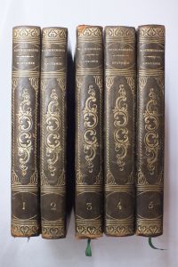 5 volumes in-8 comprenant « de Ossibus », « de Musculis Tendinibus et Bursis Mucosis », « de Cerebro et de Nervis », « de Angologia », « de Splanchnologia ». (manque le tome II). Demi-basane olive. Dos lisse orné d’un décor rocaille (erreurs de tomaison). Plats, gardes et tranches marbrés. (manquent les coiffes et une garde restaurée au tome 3).