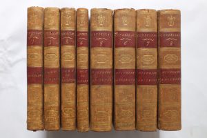 8 volumes in-8 (tome 1 : La Grammaire ; tome 2 : Traité de l’Art d’écrire ; tome 3 : De l’Art de Raisonner (9 planches rempliées) ; tome 4 : De l’Art de Penser ; tomes 5 à 8 : Histoire Ancienne) - incomplet : manquent les 5 derniers volumes. Portrait-frontispice au 1er volume. Bandeaux, lettrines et culs-de-lampe. Quelques auréoles au tome 3. Plein veau blond de l’époque (accrocs et frottements). Frise dorée encadrant les plats. Roulette intérieure et sur les coupes. Dos lisse orné de vases et de rosaces avec pièce de titre et de tomaison (quelques coiffes un peu rognées). Tranches dorées.
