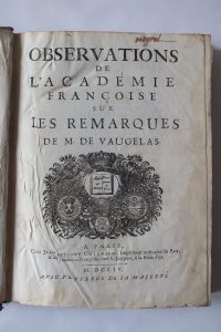 RÉGNIER-DESMARETS (Abbé), [VAUGELAS (Claude Favre de)] : « Observations de l’Académie Françoise sur les Remarques de M. de Vaugelas. » A Paris chez Jean-Baptiste Coignard, Imprimeur ordinaire du Roy 1704.