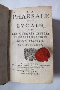 BREBEUF (traduit et adapté par Georges de) : « La Pharsale de Lucain ou les Guerres Civiles de César et de Pompée en vers françois. » A Paris chez Jean Baptiste Loyson 1670.