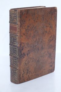 Petit in-4 carré avec 4 tables généalogiques des Familles Royales d’Angleterre et d’Ecosse, depuis Guillaume Le Conquérant jusqu’à présent, 2 cartes géographiques et 2 planches rempliées représentant 48 portraits. Pleine basane marbrée de l’époque. Dos à nerfs orné de motifs floraux avec pièce de titre en maroquin (coiffe supérieure rognée).