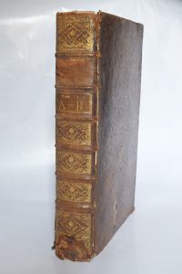 In-folio. Tome premier seul. Bandeaux, lettrines et cul-de-lampe. Veau marbré de l’époque. Dos à nerfs orné de motifs floraux (manque la pièce de titre). Mors et coiffes abîmées. Des restes de parchemin (écrits en caractère gothique textura) qui garnissent en partie le dos dépassent des charnières à l’intérieur des gardes
