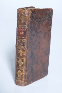 In-24. Texte encadré par un double filet. Importantes rousseurs aux pages 104 et 105. Plein veau granité de l’époque. Dos lisse orné de fleurs de lys avec pièce de titre en maroquin grenat (coiffe supérieure rognée).