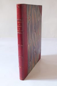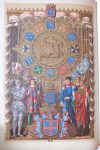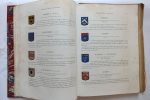 Imprimerie Simon Raçon et Cie. In-folio. Frontispice en chromolithographie par KELLERHOVEN. 98 pages ornées de blasons rehaussés de couleurs sur papier, découpés et contrecollés. Texte manuscrit sur 32 pages réglées à partir de la page 65. Les 4 dernières pages contiennent des blasons sans texte. 2 feuillets manuscrits de table in fine. Rousseurs. Demi-maroquin rouge à coins. Dos à faux nerfs daté au talon. Plats et gardes marbrés. Tranches à la feuilles d’or.
