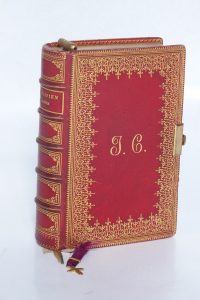 In-16 avec un frontispice et 3 figures hors texte en couleurs d’après Louis-Joseph HALLEZ. Plein maroquin rouge par Adolphe BERTRAND. Filets dorés et décor « à la dentelle » encadrant les plats avec initiales au centre du premier. Roulette intérieure. Dos à faux nerfs orné de caissons dorés. Gardes de tissu rose. Fermoir doré en forme de croix pattée. Signet terminé par une croix dorée. Tranches à la feuille d’or. Superbe exemplaire.