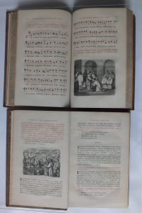 3 volumes in-8 (complet). Texte imprimé en rouge et noir. Nombreuses vignettes et partitions de musique. Rubriques sur les sacrements et les sacramentaux (chants, prières, lectures, ordinations, bénédictions, synodes, élections, excommunications, processions…) Pleine basane racinée de l’époque. Dos lisse orné avec pièce de tomaison. Gardes et tranches marbrées. Bel exemplaire. Rare série complète de cet ouvrage liturgique qui contient l’ensemble des rites suivis par les évêques au XIXème.