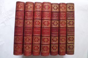 7 volumes grand in-8 illustrés de figures in-texte et planches hors-texte. (mammifères I et II, oiseaux I et II, insectes I, reptiles, mollusques) Quelques pages détachées. Rousseurs. Plein chagrin rouge. (reliures à différents motifs). Plats ornés d’un décor d’encadrement à froid. (un volume dérelié). Dos à faux nerfs orné de caissons. Coins usés.