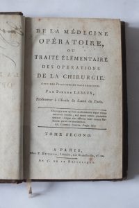 LASSUS (Pierre, Professeur à l’Ecole de Santé de Paris) : « De la Médecine Opératoire, ou Traité Élémentaire des opérations de la Chirurgie. » A Paris chez F.Buisson An 3 de la République.