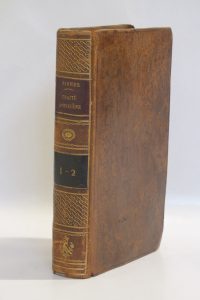 2 tomes en un volume in-8 (tome I : de l’air atmosphérique, des saisons, des climats ; tome II : des Alimens, des exercices spontanés, des gestations, du repos). Quelques rousseurs éparses. Pleine basane racinée de l’époque. Dos lisse orné de frises, d’une rosace et d’un oiseau avec pièce de titre et de tomaison en maroquin (coiffes un peu rognées).