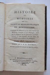 BAUMES (Jean Baptiste Théodore) : « Histoire et Mémoires de la société de médecine-pratique de Montpellier. » A Montpellier de l’Imprimerie de Jean-Germain Tournel, 1816.