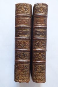 3 parties en 2 forts volumes in-8. (complet avec le traité des aliments et des boissons au tome II). Pleine basane marbrée de l’époque (légers frottements). Dos à nerfs orné de motifs floraux avec pièce de titre et de tomaison (coiffes supérieures un peu rognées). Coins usés. Bon état général.