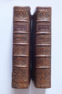 2 volumes in-12. 2 planches rempliées et bois gravés in-texte et hors-texte. Petit manque au coin de la page 57 du tome II. Pages de « l’éloge » interverties. Pleine basane marbrée de l’époque. Dos à nerfs orné de motifs floraux (légers accrocs et restaurations).