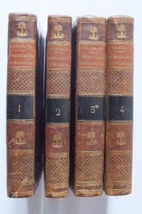 4 volumes in-8 avec 2 tableaux repliés (complet). Rousseurs éparses. Très belle reliure uniforme en pleine basane racinée de l’époque. Frise dorée sur les coupes. Dos lisse orné de frises et serpent dans un palmier avec pièce de titre et de tomaison. Gardes marbrées. Coins usés.