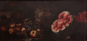 Huile sur toile, 48 x 99. Œuvre en très bonne condition. Au dos de la toile, l’inscription «G. M. R. N°», à la peinture noire. Né à Rome en 1610, peintre de fruits et de natures mortes, il y travailla jusqu’à sa mort en 1670. Elève de Fioravanti, il fut un des meilleurs peintres de fruits de l’école italienne. Le musée Suermondt à Aix-la-Chapelle expose un tableau fort pareil, de plus grande dimension. Pièce remise en vente pour folle enchère.