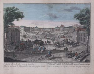 Vue d’optique. Vue gravée en coloris d’époque, 32 x 41,5. Marge. Signée «Georg Balthasar Probst excud. A. V.» dans la plaque. Sous verre et passe-partout, dans un cadre de bois ciré.