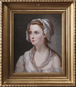 Huile sur panneau de bois, 46 x 37. Dans un cadre orné doré ancien (étiquette manuscrite au dos du cadre). Célèbre peintre français, né à Tournus en 1725, et mort à Paris en 1805, il acquit sa plus grande popularité dès le milieu du XVIIIème siècle. Copie de qualité d’un de ses nombreux portraits féminins.