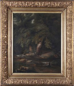 Huile sur toile, 45 x 37. Signée «J. Linnel» en bas à droite. Dans un cadre sculpté doré soigné. John Linnel ou Linnell, portraitiste, paysagiste et graveur anglais, né en 1792 et mort en 1882. Fils d’un sculpteur sur bois et marchand de tableaux. Elève de Benjamin West et de Varley, puis des écoles de la Royal Academy. Peintre de sujets pittoresques, il traduisit la nature avec une grande supériorité (Bénézit).