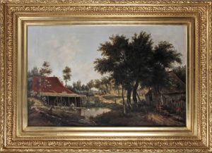 Huile sur toile, 54 x 85. En belle condition. Dans un large cadre orné doré. Pièce d’eau ombragée, animée d’un pêcheur, et d’autres personnages.