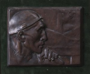 Médaillon en bronze, 15,5 x 20,5. Signée «C. Meunier» en bas à gauche. Dans un cadre de bois ciré à champ de velours vert. En bonne condition.