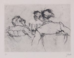 Très fraîche. Sous verre et passe-partout, cadre argenté. Titre au dos sur une étiquette imprimée (n° 12; la scène montre trois amis trinquant).