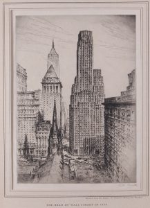 Eau-forte, 35,5 x 25. Epreuve sur Japon léger, marges. Signée «A. Schmitz» au crayon en bas à droite. Titre imprimé au passe-partout, et «Showing the Irving Trust Company’s New Headquarters Building at One Wall Street»).