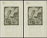 Ensemble de 4 eaux-fortes, 19,5 x 15,5. Epreuves sur documents anciens 38,5 x 23. Chacune signée et justifiée «9/25» au crayon rouge en dessous. Sous verre et cadre de bois naturel, l’ensemble en très belle condition.