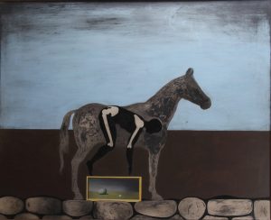 Huile sur panneau, 100 x 121. Signée et datée «h. alexis Keunen. 2 / 57» au dos, et titrée. Encadré. Peintre surréaliste né à Liège en 1921 et mort à Rouen en 1989 (où il s’était installé en 1959; certaines sources signalent son décès en 1992). Elève à Saint-Luc de Liège. Influencé par Magritte, il fut également graphiste, créateur de décors de théâtre, illustrateur, etc.