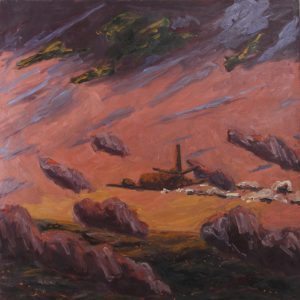 Huile sur toile, 100 x 100. En belle condition. Peintre né à Liège en 1961, formé à l’Académie de Liège. Elève de F. Beunckens, il est souvent inspiré par des avions solitaires fendant le ciel.